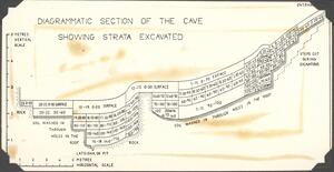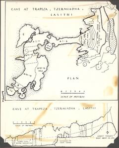 Material relating to the excavation of Trapeza Cave near Tzermiado, Lasíthi Plain, Crete (4-19 May 1936). This excavation took place under the auspices of the British School at Athens and was conducted by John Pendlebury, Hilda Pendlebury, Mercy Money-Coutts and Ralph Lavers. With Manolaki (from Knossos) and Ioannes Meliarakes as foremen. The notebook contains: a list of workmen (mainly from Tzermiado); a description of the cave including location, what locals said about the cave and sherds found on an earlier trip in June and July 1935; diagrams of stroses [stratigraphy] inside and outside the cave; a hand drawn plan of the Lasithi plain; a cross section diagram of part of the cave; a rough diagram of the cave divided into sections based on a sketch by [Ralph] Lavers; a “diagrammatic section of the cave, showing strata excavated”; and a catalogue of photographs listing negative numbers, description and how numbered objects were arranged in the photographs. The notebook also contains (written from the other end of the book): notes on the analysis of “stroses” [stratigraphical layers] including details of objects found in sections and bones thrown away; catalogues of finds divided into “stone vases and objects”, “beads, buttons etc and miscellaneous”, “metal” detailing reference numbers, material, dimensions, any remarks, the provenance (exact section of cave), whether there was a drawing and photograph number; and lists of seals and figurines divided into type and detailing reference number and material. Mostly in John Pendlebury’s handwriting, but also includes notes in Hilda Pendlebury’s handwriting and another person’s [possibly Mercy Money-Coutts or Ralph Lavers].