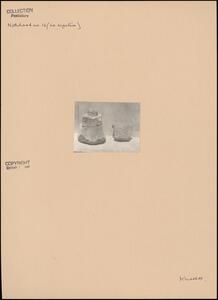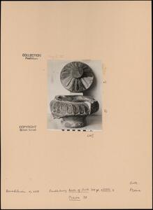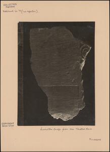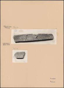 Photograph of 2 small stone pieces, one carved, from Knossos, mounted onto a sheet of paper