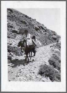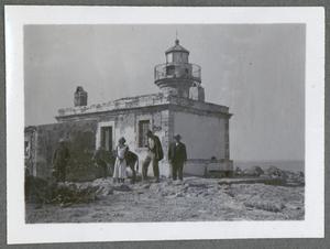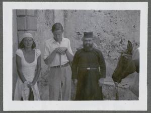 Photograph of Joan and Seton Lloyd, [2 guides] and 2 donkeys standing outside “The Lighthouse” at Kavo Sidero [Sídheros, Ákra (cape)], Crete