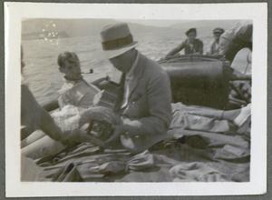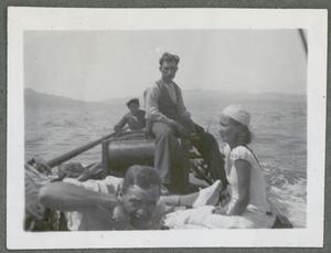 Photograph of group including John Pendlebury and Joan Lloyd “on the boat” between Sitia [Sitía] and Kavo Sidero [Sídheros, Ákra (cape)], Crete