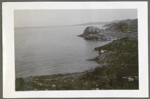 [PEN/7/2/6/104], Photograph of Joan Lloyd, Seton Lloyd and John Pendlebury, sitting on a wall on the coastal “Road to Pakhyammos” [Pacheía Ámmos], Crete, 21 Apr 1934