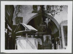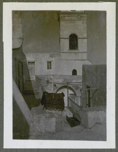 [PEN/7/2/6/1], Photograph of a man holding a cross made of palm leaves captioned “The Papas of Makryteikhos [Makritoíkhos], Palm Sunday”, [at the Villa Ariadne, Knossos], Crete, 25 Mar 1934