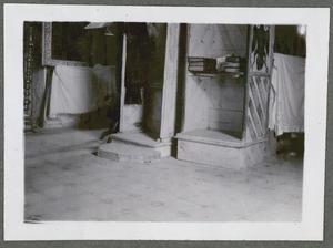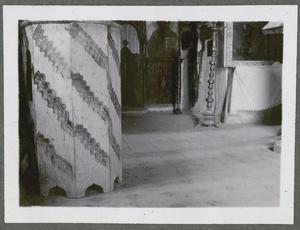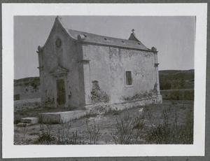 Photograph of a man holding a cross made of palm leaves captioned “The Papas of Makryteikhos [Makritoíkhos], Palm Sunday”, [at the Villa Ariadne, Knossos], Crete