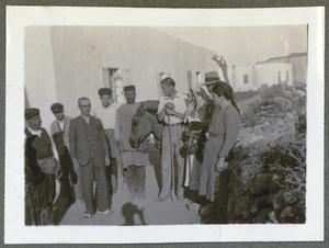 [PEN/7/2/6/152], Photograph of Joan and Seton Lloyd, [2 guides] and 2 donkeys standing outside “The Lighthouse” at Kavo Sidero [Sídheros, Ákra (cape)], Crete, 24 Apr 1934