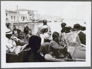 [PEN/7/2/6/95], Photograph of Seton and Joan Lloyd, another man and a crowd of children standing next to a car, with the driver and Tristram Hillier sitting inside, in Agios Nikolaos [Áyios Nikólaos], Crete, 21 Apr 1934