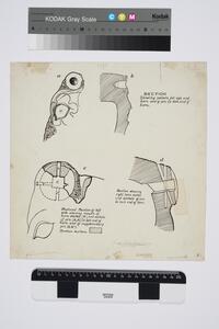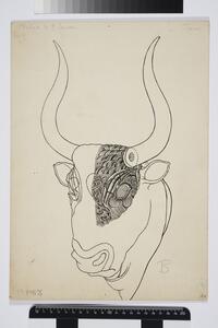 B/W ink drawing and description of the construction processes to create a bull’s head rhyton from steatite. Specifically, it shows the locking mechanisms to attach the horns. It is labeled “27a” on the front.
