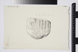 Watercolour and ink drawing of a clay seal found in the Rhyton well. Drawing shows impression of the seal as well as a section of it. There are minor annotations written in pencil.