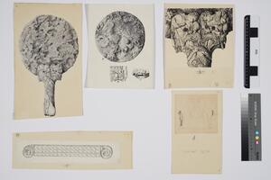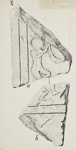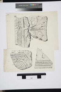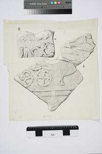 B/W ink drawings of fragments from grave stelae X and XI in the Grave Circle. MYC 3/4/06/1 - MYC 3/4/06/3 are glued together.