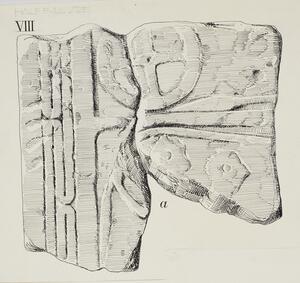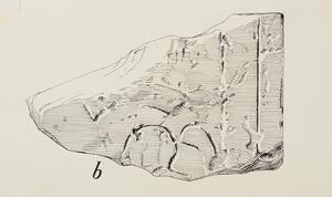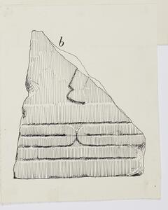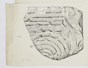 B/W ink drawing of fragment “d” from stele VIII. The fragment is badly damaged and not much is discernable other than four parallel horizontal lines. It is labeled “76” on the back.