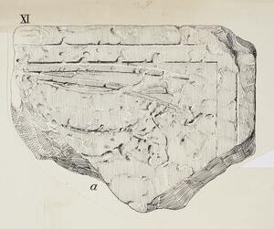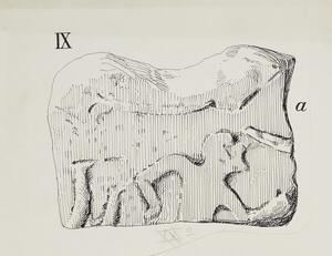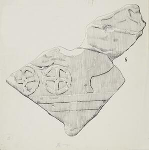 B/W ink drawing of fragment “a” from grave stele XI displaying the forepart of a horse, reins, and a long lance pointed in the same direction as the horse. The stele is badly damaged and the images are almost indistinguishable. MYC 3/4/06/1 - MYC 3/4/06/3 are glued together.