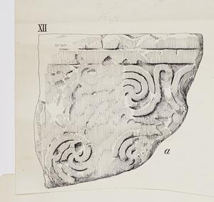 B/W ink drawing of fragment “a” from grave stele XII displaying several spirals and loops. The fragment is the top left corner of the stele. It is labeled “74” on the back. MYC 3/4/07/1 - MYC 3/4/07/5 are glued together and represent fragments of the same stele.