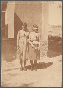 Depicts the two young women outside a house near Mycenae. Handwritten caption: “Helene and Iannoula”.