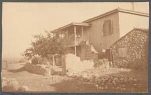 Depicts the house near Mycenae where the B.S.A. group stayed. Handwritten captions: “The dig house" and "MABH”.