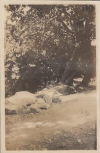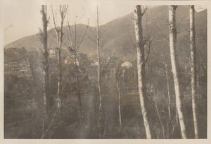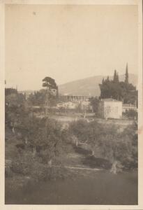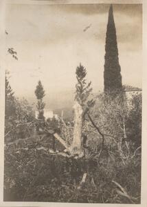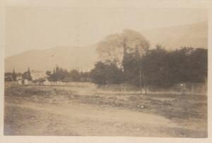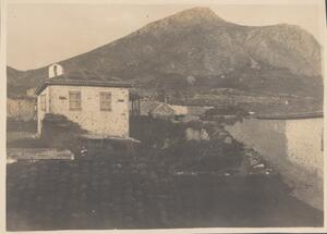 Depicts a view of Hymettus in Athens. Handwritten caption: “The school garden. Hymertus”. In the top right hand corner of the page is "1920". Enlarged version of LAM/3/1/2/1