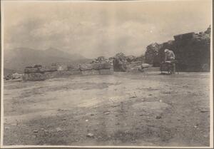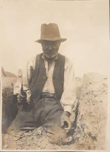 Depicts Manoli excavating at Mycenae. Handwritten captions: “Manoli." and "AB”.