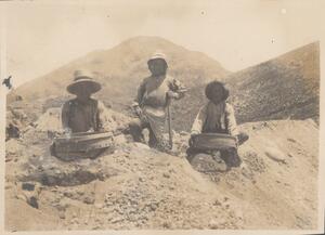 Depicts three people sieving the earth at the excavation, outside grave 502. Handwritten captions: “’Koskiniging – outside Grave 502." and "AB”.