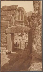 Depicts the lion gate at Mycenae. Handwritten caption: “The Lion Gate”.