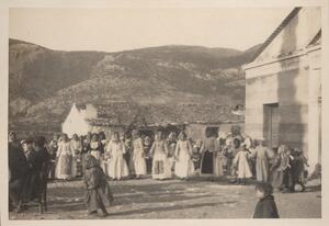Depicts women dancing in traditional dress at Khasia, in the Peloponnese. Handwritten caption: “Khasia. Wedding Dance”. Enlarged version of LAM/3/1/2/6.