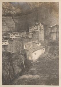 Depicts the view of the monastery in the Peloponnese. Handwritten caption: “The Monastery. Megaspelion.” Enlarged version of LAM/3/1/2/43.