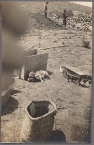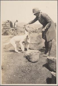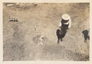 Depicts her playing with a dog at the excavation of Thermi. No caption.Helen Waterhouse has written "WL".