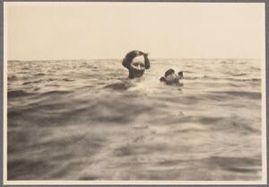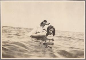 Depicts an unidentified woman and dog swimming at the sea. No caption.