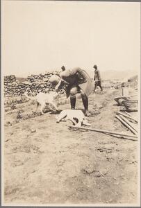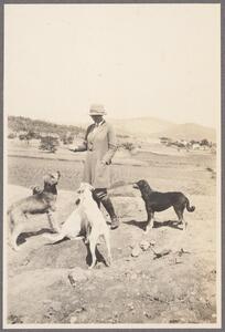 Depicts her playing with two dogs at the excavation of Thermi. No caption. Helen Waterhouse has written "WL".