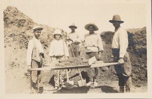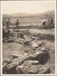Depicts some of the workmen at the digging of Thermi, with some ruins and stones. No caption.