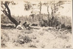 Depicts the group having a picnic, probably near Thermi. No caption. Winifred Lamb is at the foreground. The rest, remain unknown.