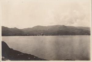 Depicts the landscape of the bay, with some rocks at the foreground and some mountains at the background. No caption.