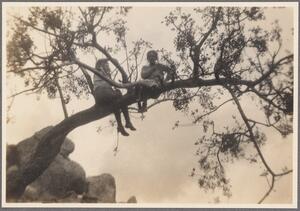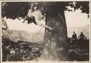 Depicts probably the same man as in LAM/3/1/12/60, but in a different tree, and some people at the background. No caption.