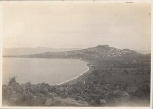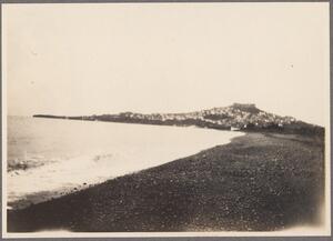 Depicts the view of the sea, with a town at the background, with a castle at the top of a hill, probably Molyvo. No caption, but Helen Waterhouse wrote at the top of the page “Molyvo?”