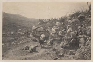 Depicts a view of the excavation of the ruins at Mycenae, with Georgi and Andrew. Handwritten caption: “The Terrace of the Pithoi”. Enlarged version of LAM/3/1/3/76.