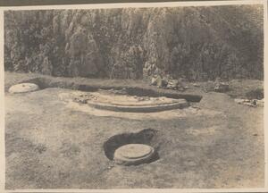 Depicts the excavations and ruins at Mycenae. Handwritten caption: " The tomb of Aegisthus".