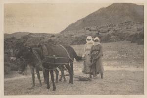 Depicts two women with a donkey pulled thresher. Handwritten caption: “Mycenae. Threshing”. Enlarged version of LAM/3/1/3/72.
