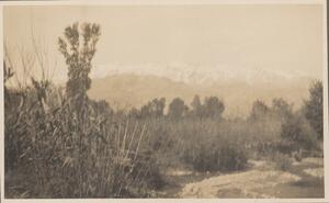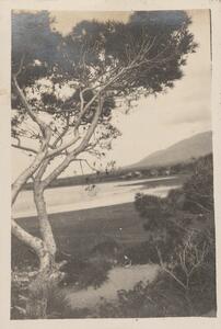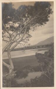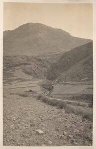 Depicts a view of the Greek landscape. Handwritten caption “Near Miraka. 2. III. 23”. At the top right corner of the album page is written “OLYMPIA”. At the bottom of the page is written: “27. III. 23 to 3. III 23”.