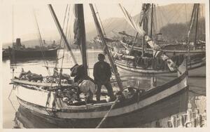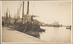 Depicts Laigus unloading pottery from a boat in the harbour. Handwritten caption “Mitylene. Spring 1928. Iaigus unloading pottery”. Enlarged version of LAM/3/1/10/46 and LAM/3/1/11/2.