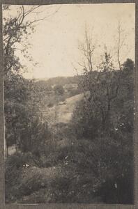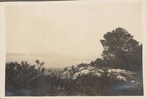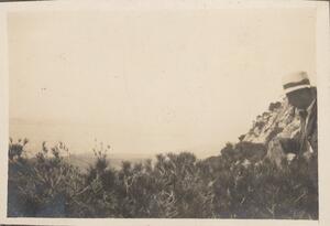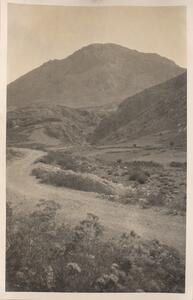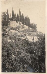 Depicts a view of the Greek landscape on Hymettus. Handwritten caption “On the way up”.