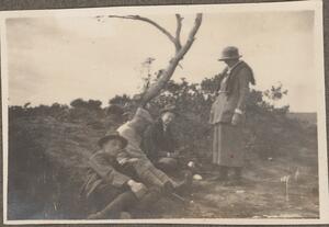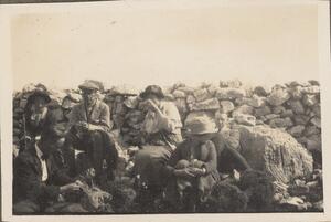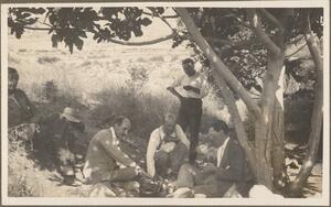 Depicts H. possibly Hutchinson, Alan Wace, W.H. possibly Heurtley, Axel Boethius and Piet De Jong. Handwritten caption: "Tea under the fig tree. H. ASBW. WH. AB. PdeJ."