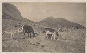 Depicts a view of the mountains and donkeys in the Greek landscape. Handwritten caption: "The Threshing floor".