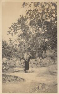 Depicts a woman, possibly Winifred Lamb, at Aegina. Handwritten caption: “Aegina. Autumn 1927”. Enlarged version of LAM/3/1/10/15.