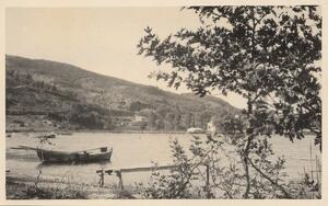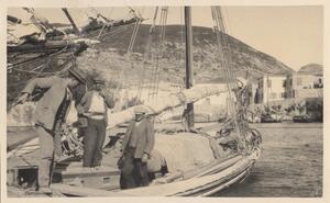 Depicts men on a boat in the harbour. Handwritten caption “Naupaktos 1927”. Enalrged version of LAM/3/1/10/27