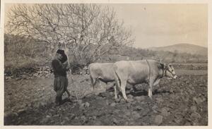 Depicts a man ploughing a field in an unknown location in Greece, Possibly Vonitsa. No caption.