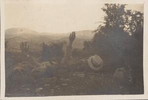 Depicts a view from the mountain and the B.S.A. group lying down, one of them it seems Charles T. Seltman. Handwritten caption: “Exhausted party arrive at the Summit of Hymettus”. At the top right corner of this page is written “Hymettus”.