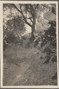 Depicts a view of the Greek landscape and cacti, near Olympia. Handwritten caption: “Miraka. 2. III. 23”.