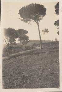 Depicts a view of the Greek landscape, near Olympia. Handwritten caption: “The way to the ferry. 3. III. 23”.
