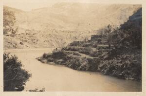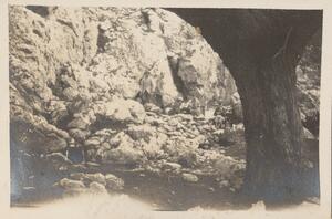 Depicts two women, possibly one of them Winifred Lamb, and two men crossing a river in Arcadia from Tsivlos to Solos. Handwritten caption: “The R. Styx 27. III. 23 AMW”
