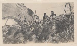 Depicts the religious men looking over a stone wall somewhere in Arcadia, possibly Megaspelion. Handwritten caption “The monks observe the approach of five strangers”.