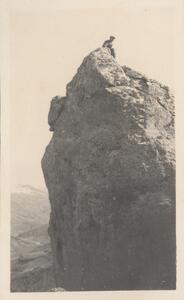 Depicts Arthur M. Woodward sitting on a rock in Arcadia. Handwritten caption “AMW” and, at the corner, “HDH”.