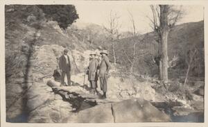 Depicts Miss O’Connell, and Charlie and Isabel Seltman, near Olympia. Handwritten caption: “Mr & Mrs Seltman. Miss O’Connell. 2. III. 23”.
