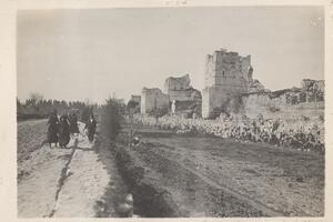 Depicts the ruins of the Theodosian city walls and the outskirts of the city with local people passing by. No caption.